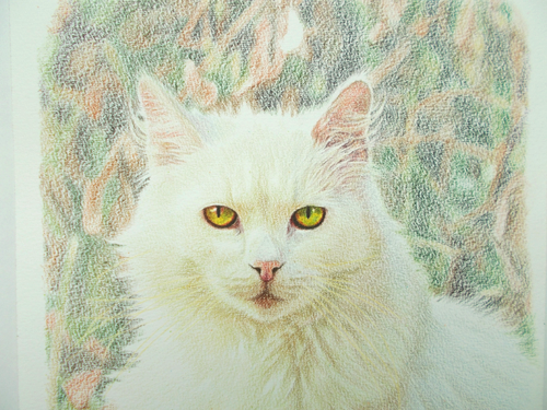 ここで初めてタッチⅡに水を使うことになりましたが、やはりパルプ紙の宿命でか、水彩色鉛筆に水入れするとバックランや筆戻りが強く、水を置いた範囲の中心は、どんなに小さく狭い範囲でも色が抜けてしまいます。結果、コットン紙の時はいい感じに表現できた虹彩の中の微妙な赤や緑のニュアンスがうまく表現できませんでした。(撮影画像では分かり難いかも知れません。)
