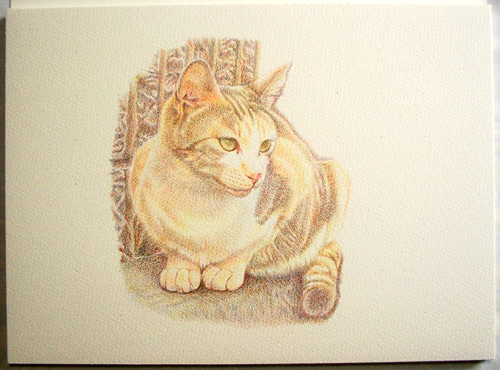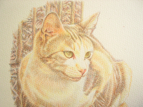 反則ですが、この絵具だけではディテールの描き込みに限界があったので、三菱アーテレーズカラー色鉛筆を補助として使いました。主に目の暗い部分、耳毛、口周りのディテールにセピア、バーントシェンナ、オレンジイエロー、バーミリオン、オリエンタルブルーを使用。