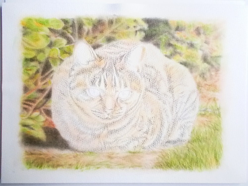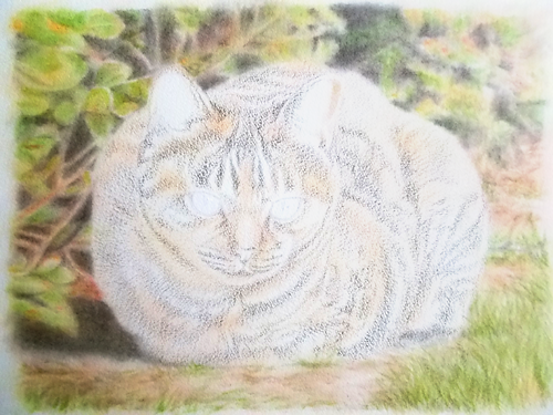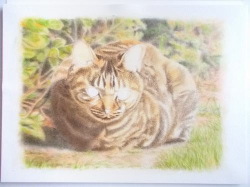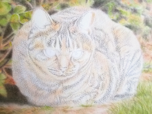 想定通りでしたが、荒目の水彩紙にソフト色鉛筆では方向を揃えるような毛並みの表現は難しい。芯先を尖らせれば方向性を与えるのは不可能ではないのですが、高価な色鉛筆をちょっと芯が減るたびにむやみに削りまくるのも抵抗感を感じますね。
